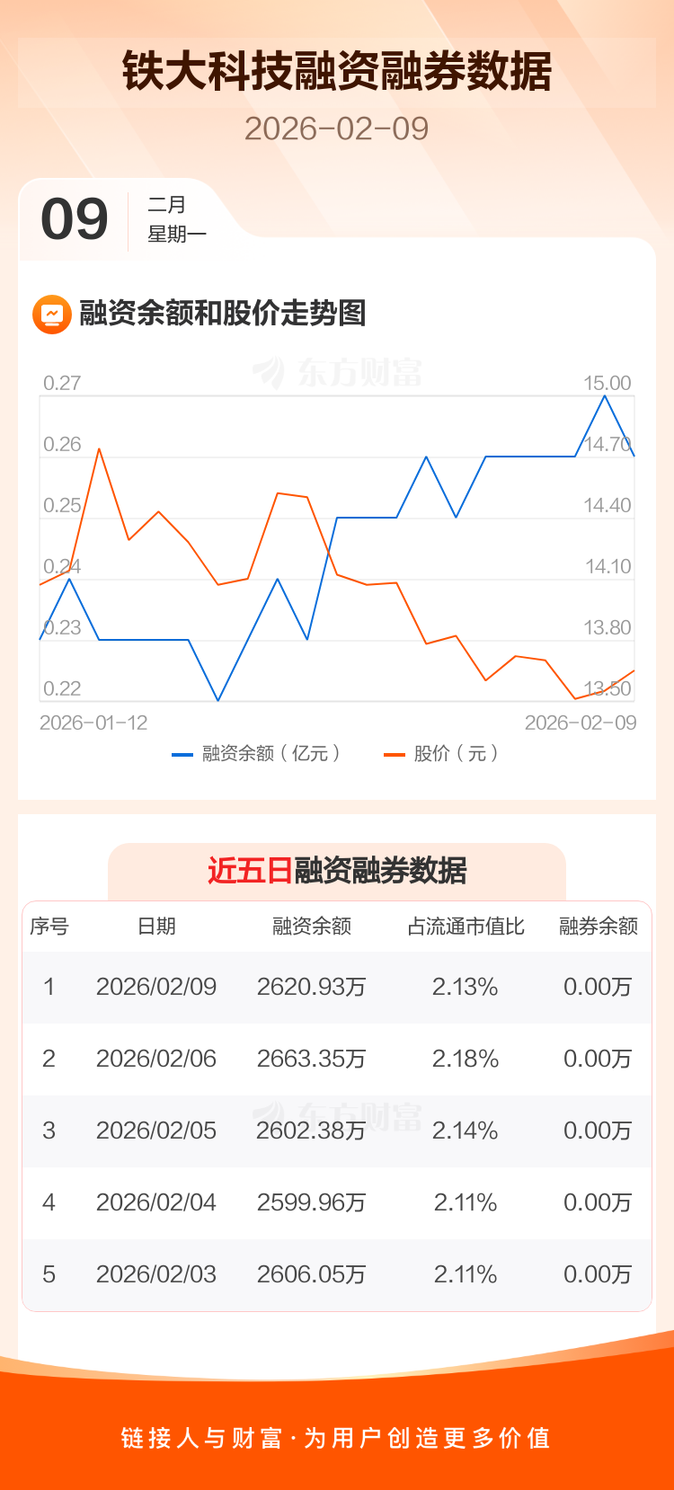 交易所最新数据显示,铁大科技于2026年2月9日获融资买入74.07万元,融资偿还116.49万元,当日融资净偿还42.42万元。目前,该股融资余额2620.93万,占流通市值比例为2.13%。