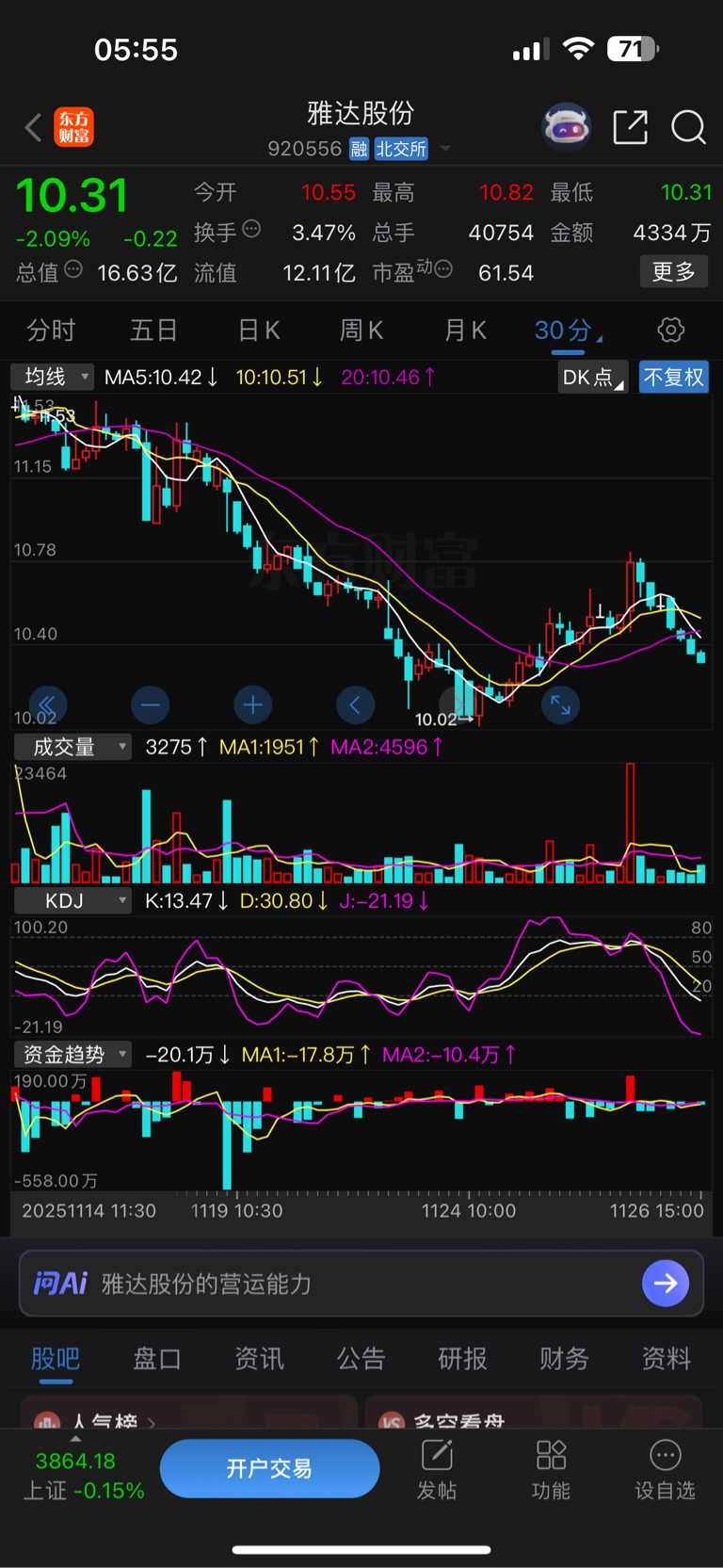 $雅达股份(SZ920556)$ 这弱性大家都了解,又发新股了95%以上高开低走半个月变僵尸?这就是北交。今天10.78出,10.38买回,没有办法的办法