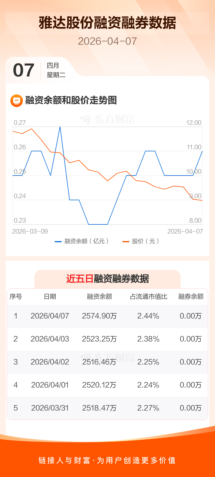交易所最新数据显示,雅达股份于2026年4月7日获融资买入124.87万元,融资偿还73.21万元,当日融资净买入51.66万元。目前,该股融资余额2574.90万,占流通市值比例为2.44%。