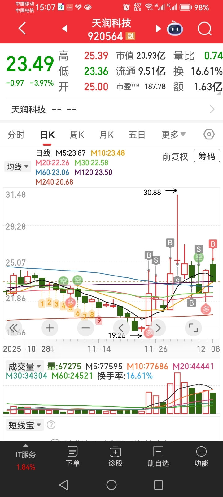 今天龙头航天发展,高位十字星炸板没有回封,明天商业航天板块高位回调,天润科技补涨反弹冲高26.65以上,站稳27.17冲高28.5乏力回落就跑。