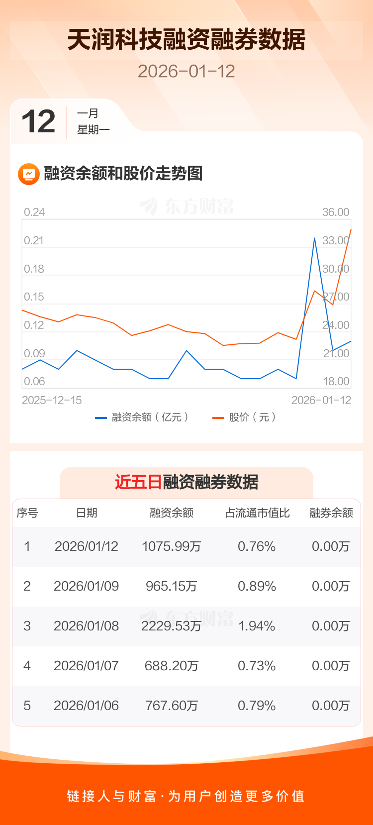交易所最新数据显示,天润科技于2026年1月12日获融资买入860.63万元,融资偿还749.79万元,当日融资净买入110.84万元。目前,该股融资余额1075.99万,占流通市值比例为0.76%。