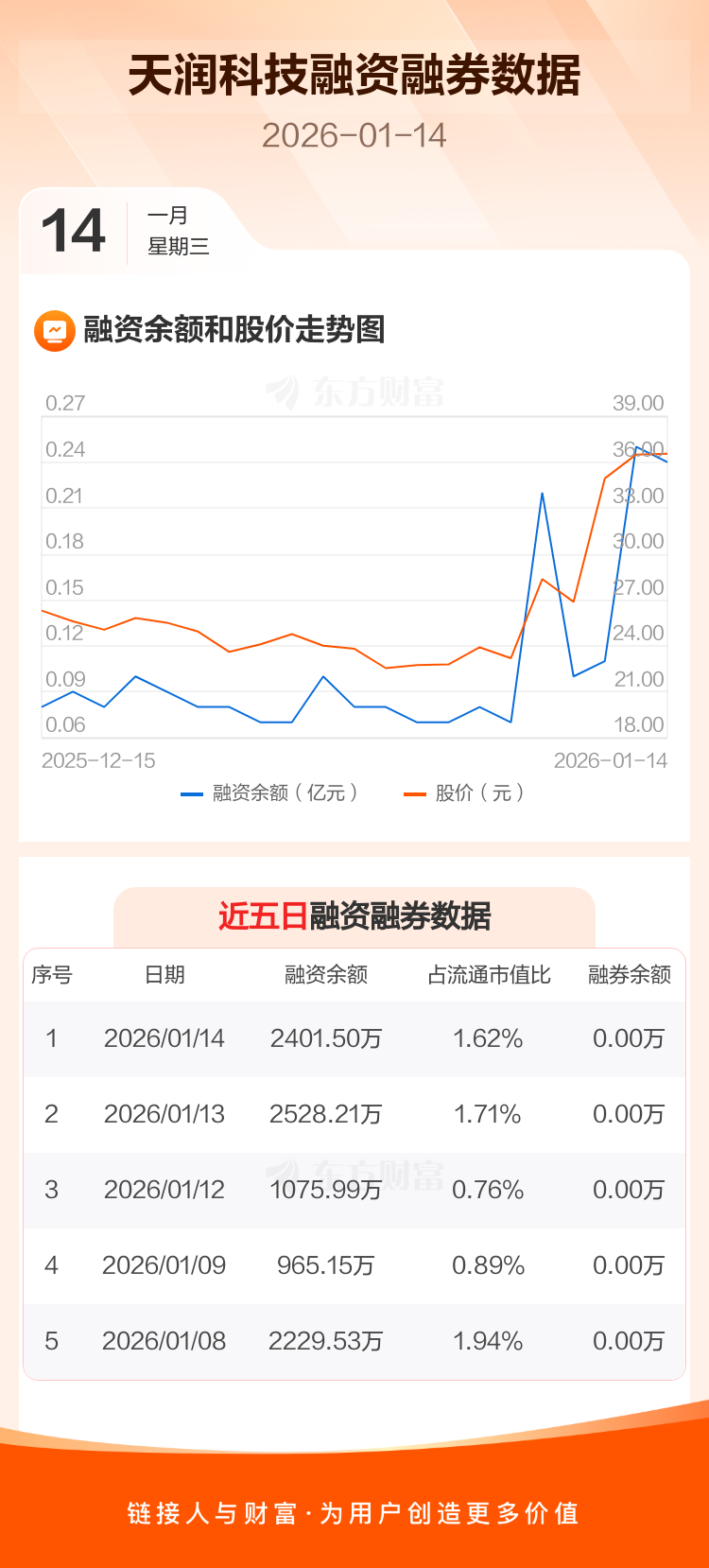 交易所最新数据显示,天润科技于2026年1月14日获融资买入1390.71万元,融资偿还1517.41万元,当日融资净偿还126.71万元。目前,该股融资余额2401.50万,占流通市值比例为1.62%。