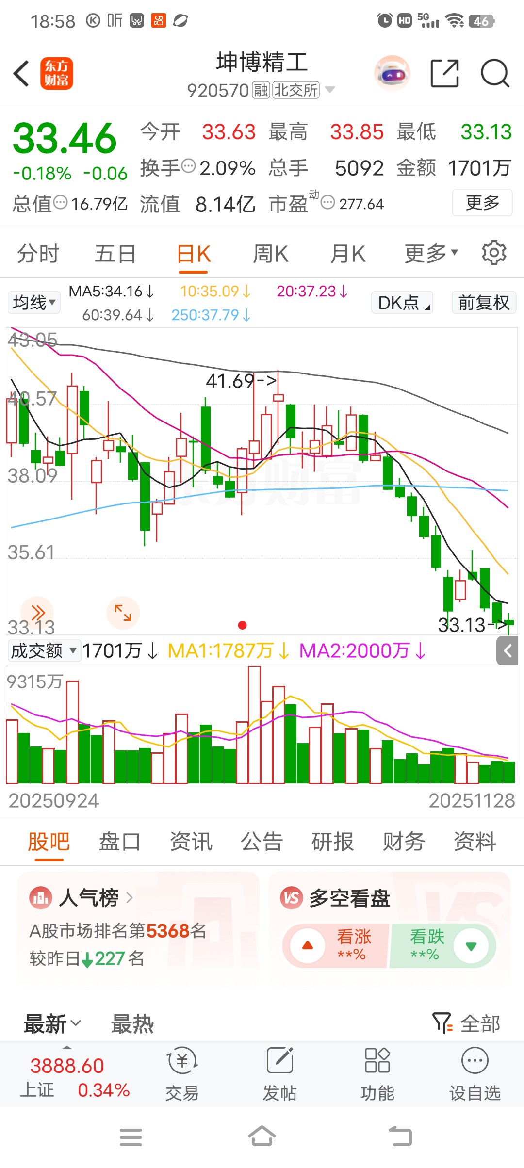 $坤博精工(SZ920570)$ 真是跌太惨了,小孩子学校又要交培训费了,主力行行好吧!我失业在家,买了你,跌了3个月了,从最高56.66元,跌倒33元,,能不能来个涨停,我实在亏太多了!能不能涨停,给我回点血,,求求主力了,周一来个暴涨吧!