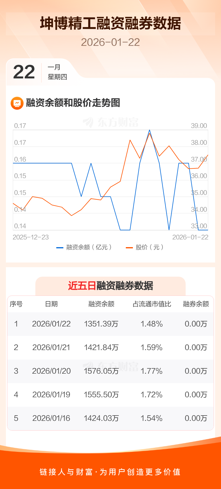 交易所最新数据显示,坤博精工于2026年1月22日获融资买入48.33万元,融资偿还118.78万元,当日融资净偿还70.45万元。目前,该股融资余额1351.39万,占流通市值比例为1.48%。