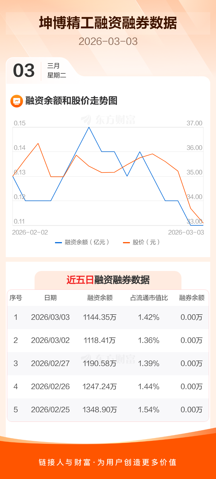 交易所最新数据显示,坤博精工于2026年3月3日获融资买入159.62万元,融资偿还133.69万元,当日融资净买入25.94万元。目前,该股融资余额1144.35万,占流通市值比例为1.42%。