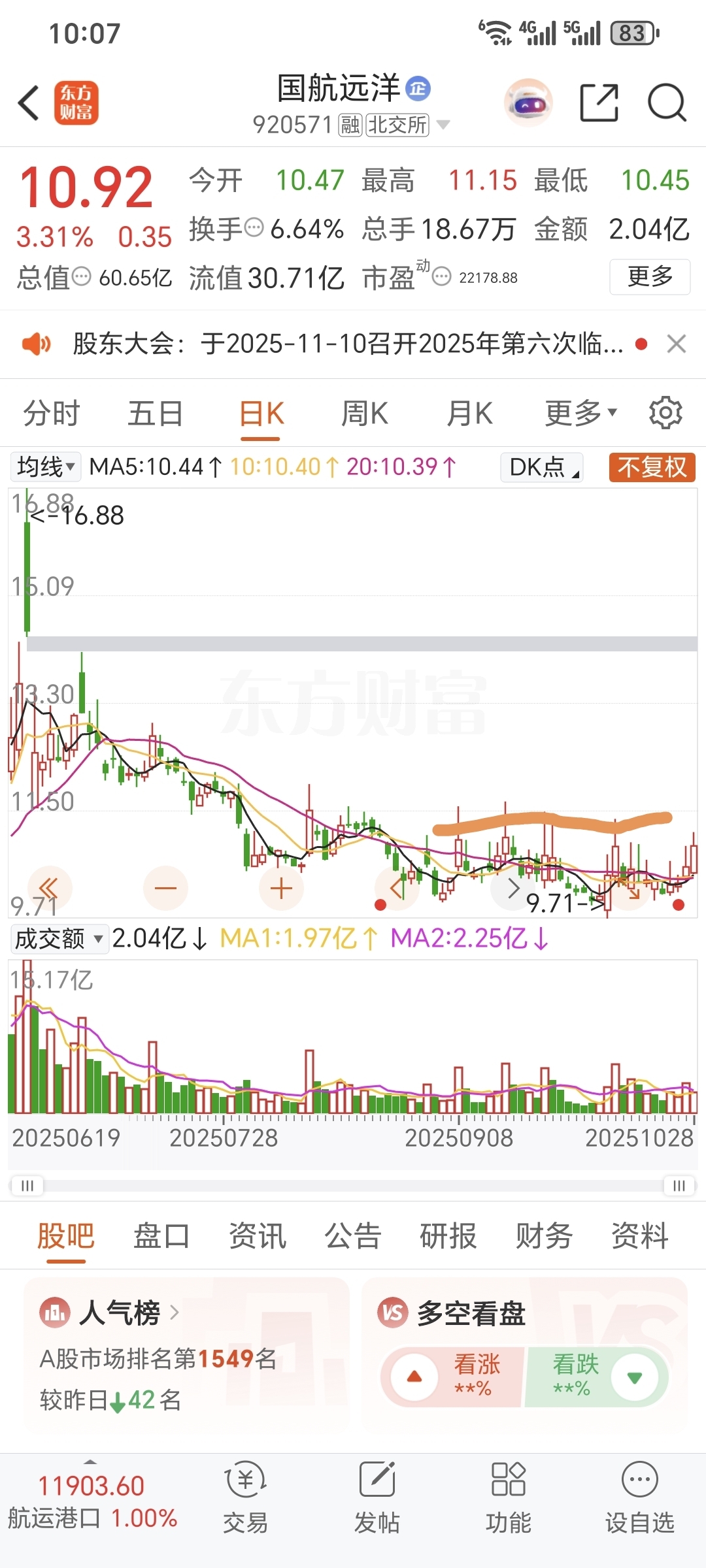 $国航远洋(SZ920571)$ 这么多上影线,没有一次突破11块5的。