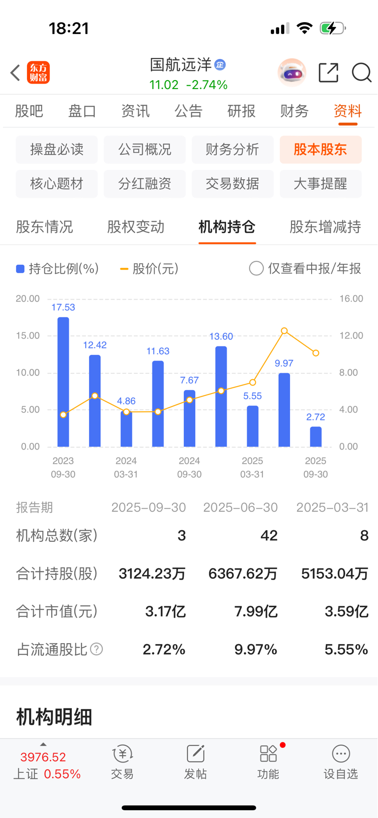 $国航远洋(SZ920571)$ 一共就3家机构在里面拿了这点股份!谁会拉上去给大家吃肉?全是韭菜和姓王和姓林一家人的股份!6月份涨那么多因为机构要跑路了!现在机构跑完了,剩下一地鸡毛!