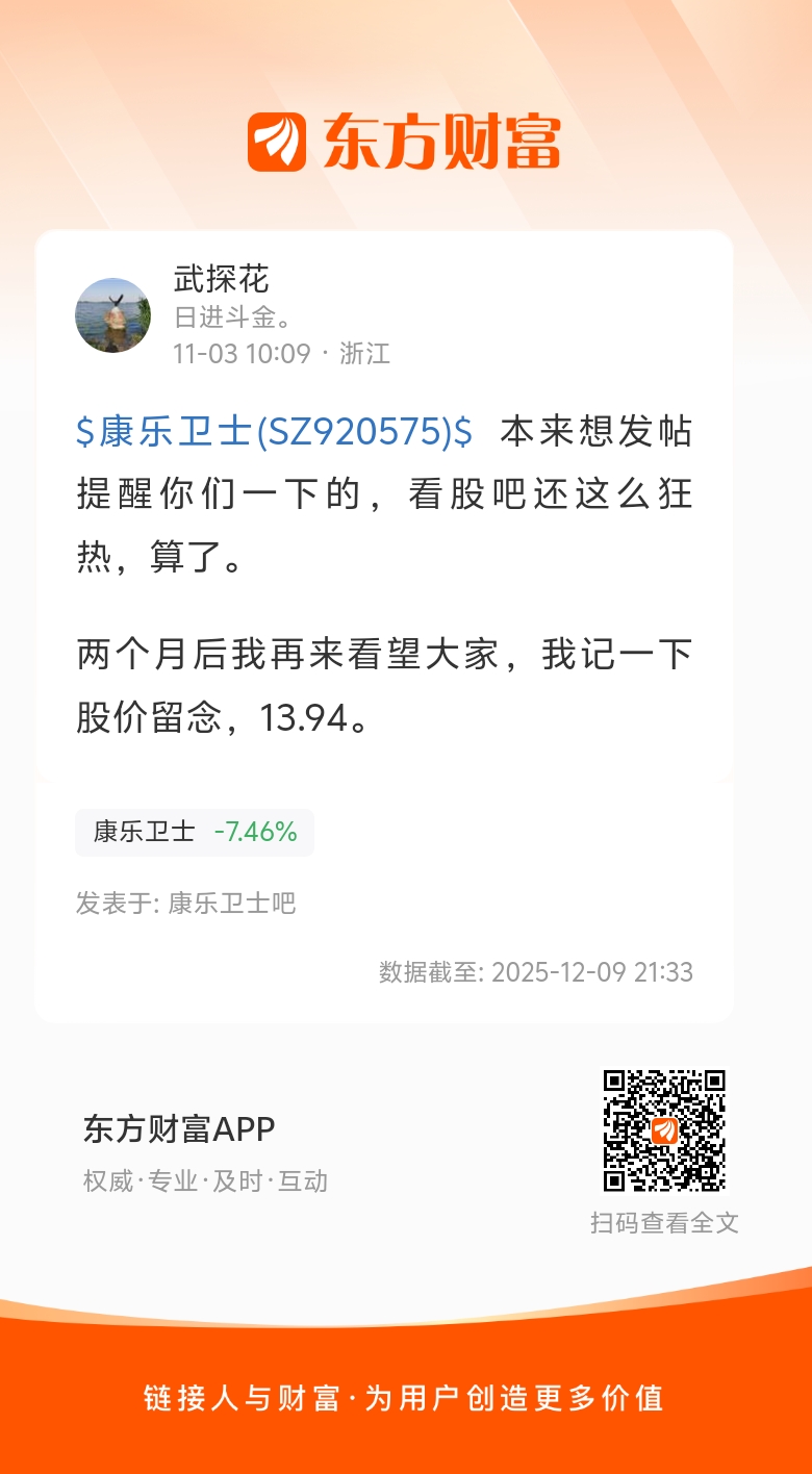 $康乐卫士(SZ920575)$ 本来想发帖提醒你们一下的,看股吧还这么狂热,算了。