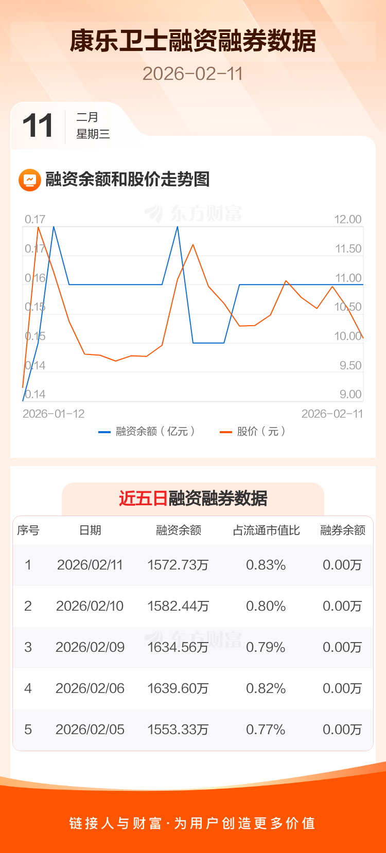 交易所最新数据显示,康乐卫士于2026年2月11日获融资买入53.93万元,融资偿还63.64万元,当日融资净偿还9.71万元。目前,该股融资余额1572.73万,占流通市值比例为0.83%。