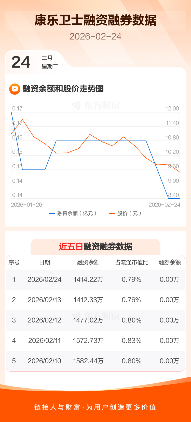 交易所最新数据显示,康乐卫士于2026年2月24日获融资买入27.37万元,融资偿还25.48万元,当日融资净买入1.89万元。目前,该股融资余额1414.22万,占流通市值比例为0.79%。