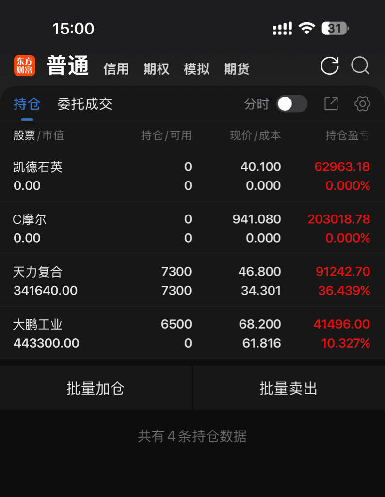 摩尔今天再次超预期直接突破了900元,但是看今天指数一直下杀,尾盘选择先出来,明天恐有调整。凯德石英上午冲高后就直接出局了,午后拍断大腿。午后北交全线拉升,当然天力复合也不例外,直接奖励个大长腿。今天上午再次把大鹏工业接回来,终究是北证没有辜负我啊,后续持续关注北证机会,不枉我叫北交扫地僧!$天力复合(SZ920576)$ $大鹏工业(SZ920091)$ $C摩尔-U(SH688795)$