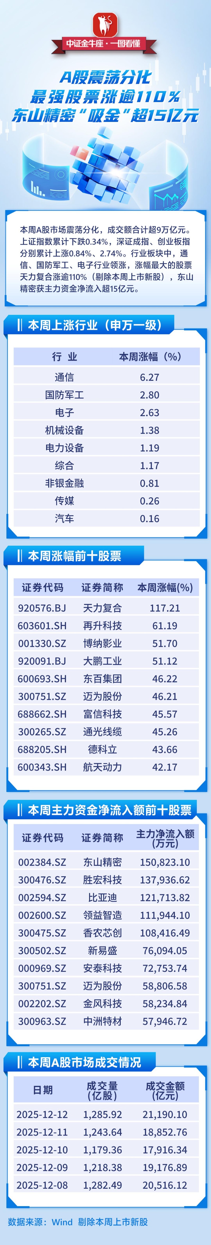 【一图看懂】本周A股震荡分化,最强股票涨逾110%,东山精密“吸金”超15亿元