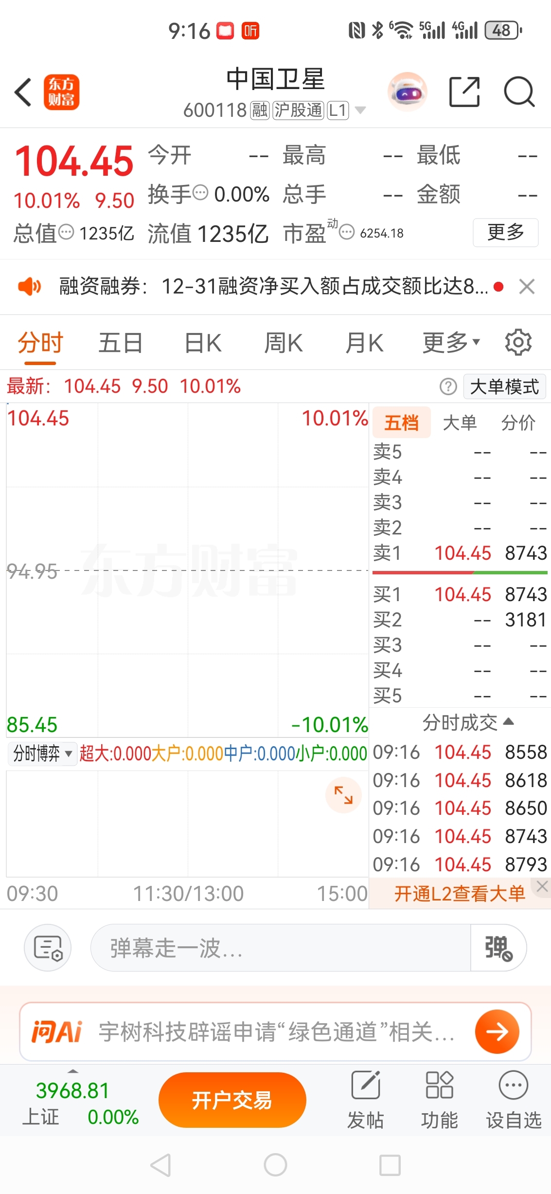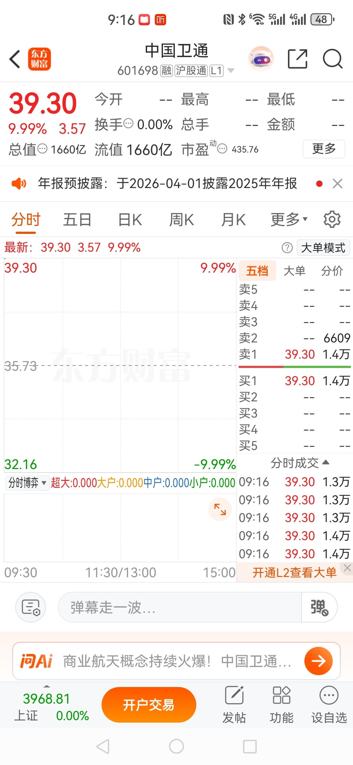 商业航天双雄中国卫星,中国卫通开盘涨停板,天力复合加油,今天继续大涨