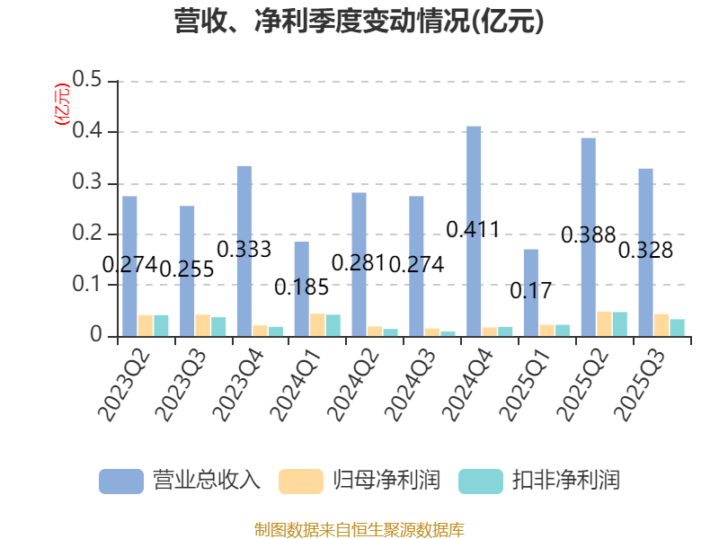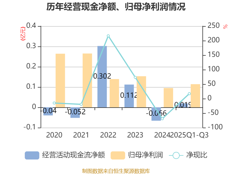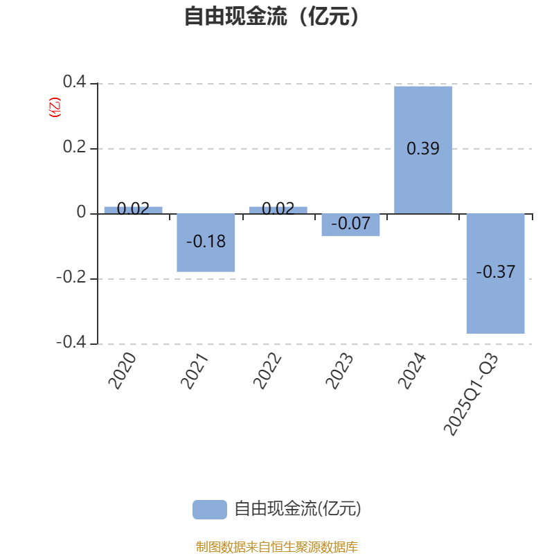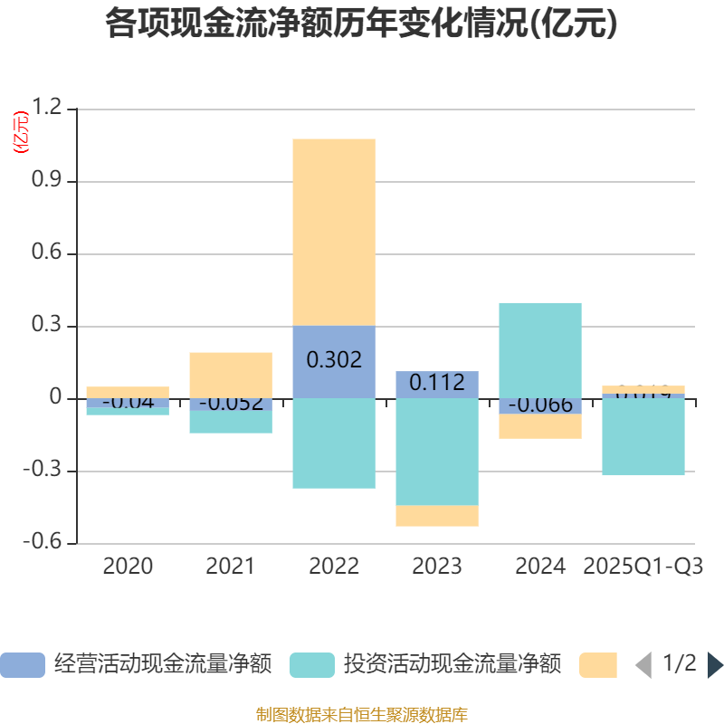 2025年前三季度,公司经营活动现金流净额为192.11万元,同比增加736.66万元;筹资活动现金流净额332.01万元,同比减少398.46万元;投资活动现金流净额-3190.23万元,上年同期为4062.51万元。