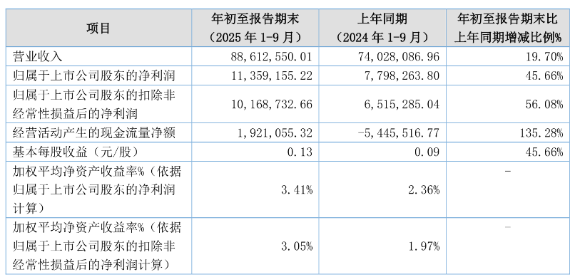 中证智能财讯科创新材(920580)10月23日披露2025年第三季度报告。前三季度公司实现营业总收入8861.26万元,同比增长19.70%;归母净利润1135.92万元,同比增长45.66%;扣非净利润1016.87万元,同比增长56.08%;经营活动产生的现金流量净额为192.11万元,上年同期为-544.55万元;报告期内,科创新材基本每股收益为0.13元,加权平均净资产收益率为3.41%。