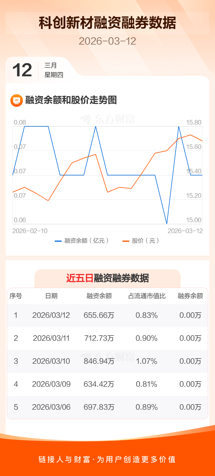交易所最新数据显示,科创新材于2026年3月12日获融资买入76.49万元,融资偿还133.56万元,当日融资净偿还57.08万元。目前,该股融资余额655.66万,占流通市值比例为0.83%。
