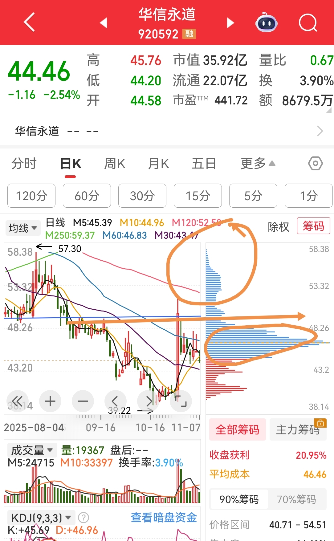 $华信永道(SZ920592)$ 50是以前的支撑位,现在的压力位,下周希望再次去冲击50,50这里应该要磨磨 ,从筹码结构看,44-50之间好多筹码 ,50以上套的筹码不是很多!第一目标50,第一目标实现后,第二目标70