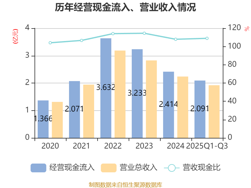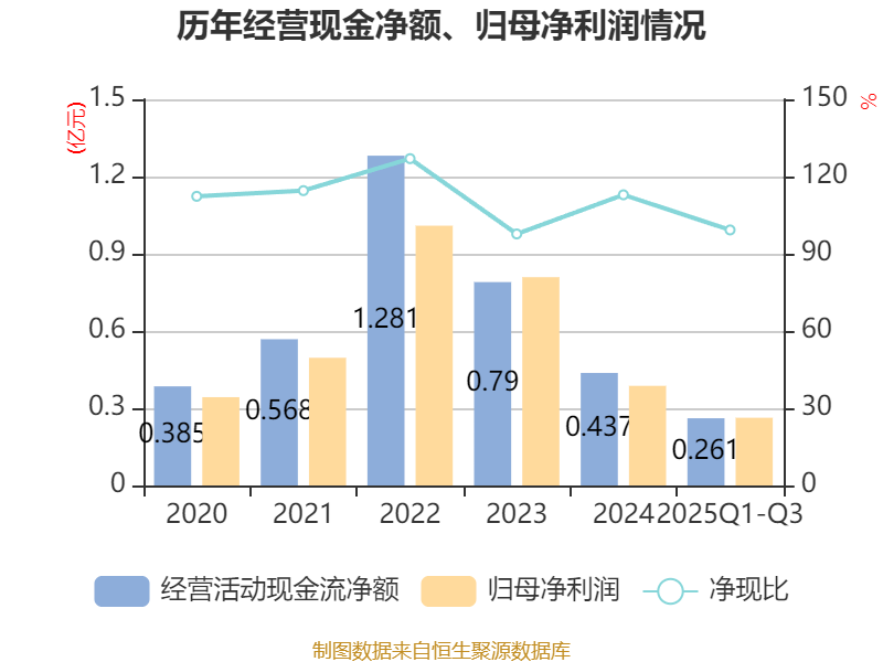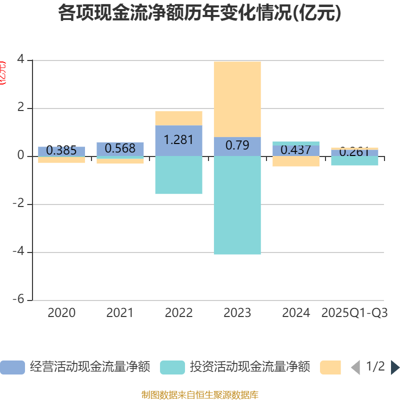 2025年前三季度,公司经营活动现金流净额为2609.03万元,同比下降17.5%;筹资活动现金流净额864.05万元,同比增加5000.06万元;投资活动现金流净额-3910.5万元,上年同期为-1576.67万元。