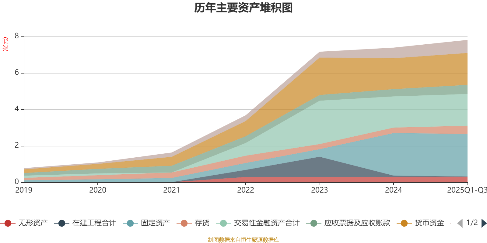资产重大变化方面,截至2025年三季度末,公司存货较上年末增加48.61%,占公司总资产比重上升1.65个百分点;固定资产较上年末增加0.24%,占公司总资产比重下降1.64个百分点;应收票据及应收账款较上年末增加25.09%,占公司总资产比重上升0.99个百分点;交易性金融资产合计较上年末增加1.85%,占公司总资产比重下降0.85个百分点。