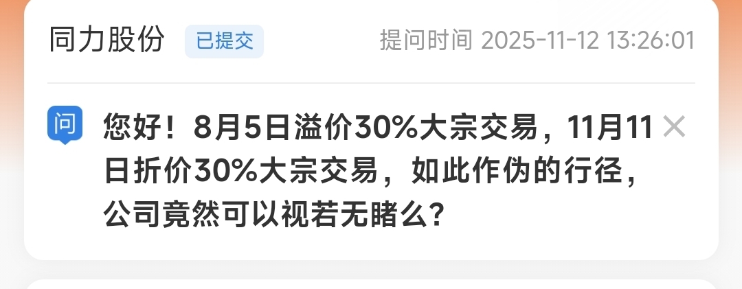 大幅溢价与大幅折价的大宗交易,关键这大宗实际并不大,上市公司面对着堂而皇之的作伪,视若无睹,不作解释,该是伤害自身给投资者的信任,公信力也被打折,这反应了,所谓的散户,从来不被实际当做股东看待,你就是个炒客而已!