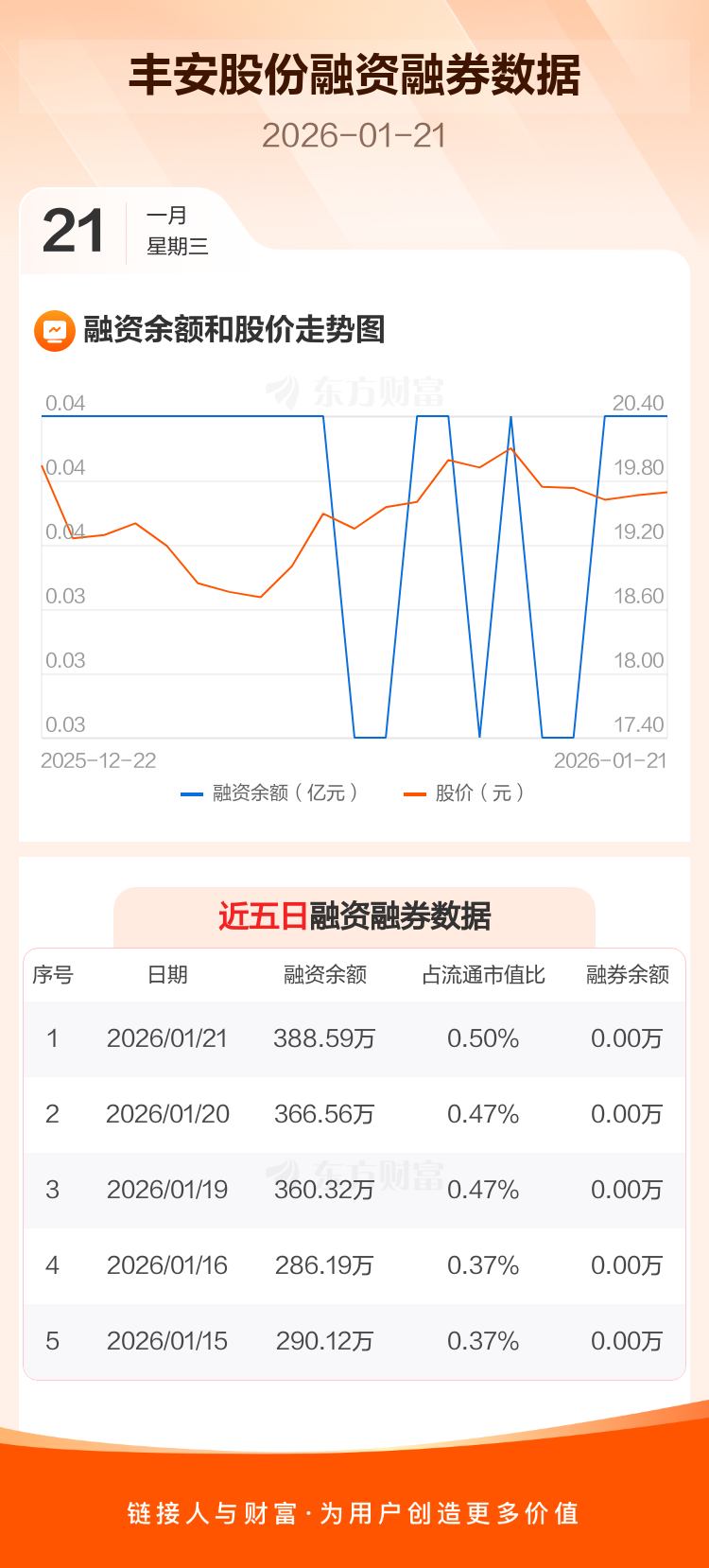 交易所最新数据显示,丰安股份于2026年1月21日获融资买入66.62万元,融资偿还44.59万元,当日融资净买入22.02万元。目前,该股融资余额388.59万,占流通市值比例为0.50%。