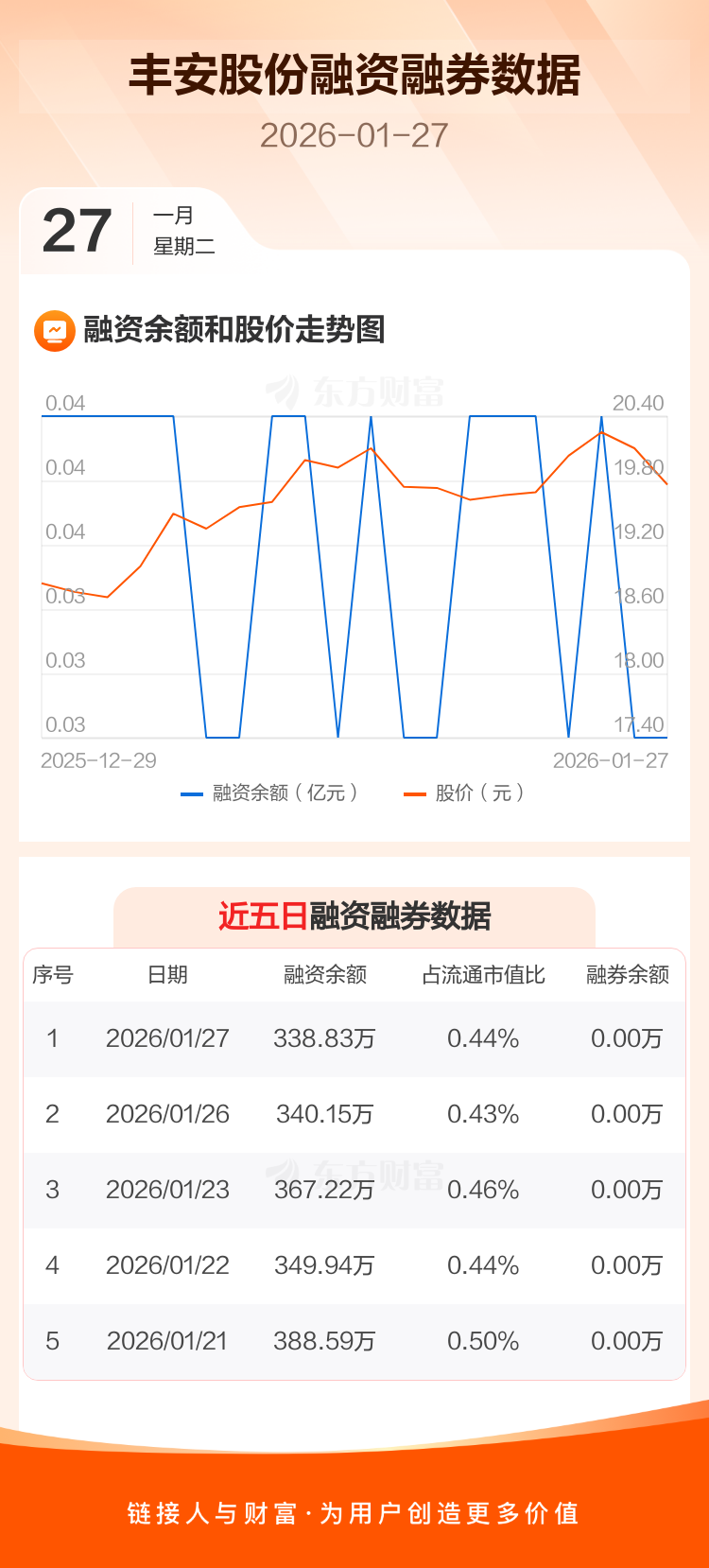 交易所最新数据显示,丰安股份于2026年1月27日获融资买入34.78万元,融资偿还36.10万元,当日融资净偿还1.32万元。目前,该股融资余额338.83万,占流通市值比例为0.44%。