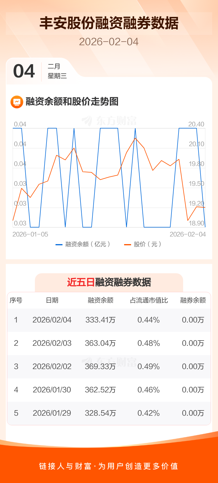 交易所最新数据显示,丰安股份于2026年2月4日获融资买入28.56万元,融资偿还58.19万元,当日融资净偿还29.63万元。目前,该股融资余额333.41万,占流通市值比例为0.44%。