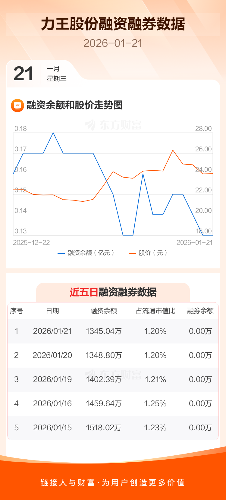 交易所最新数据显示,力王股份于2026年1月21日获融资买入98.66万元,融资偿还102.43万元,当日融资净偿还3.77万元。目前,该股融资余额1345.04万,占流通市值比例为1.20%。