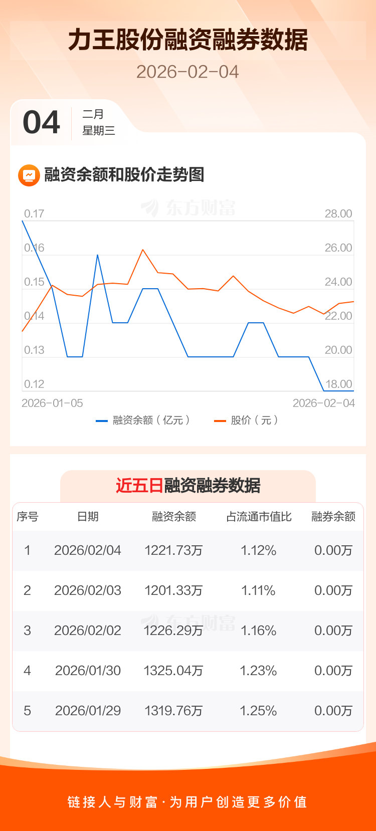 交易所最新数据显示,力王股份于2026年2月4日获融资买入118.29万元,融资偿还97.88万元,当日融资净买入20.4万元。目前,该股融资余额1221.73万,占流通市值比例为1.12%。