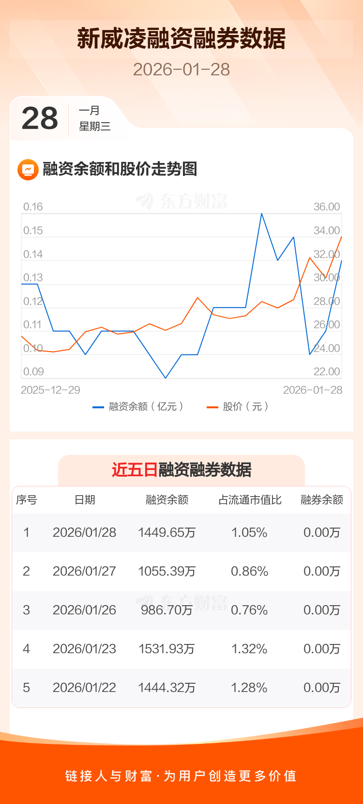 交易所最新数据显示,新威凌于2026年1月28日获融资买入1197.49万元,融资偿还803.24万元,当日融资净买入394.26万元。目前,该股融资余额1449.65万,占流通市值比例为1.05%。