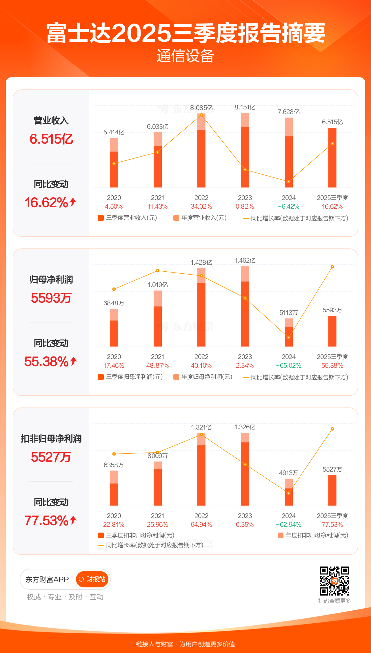 富士达10月29日发布2025年三季报显示,公司前三季实现营业收入6.52亿元,同比增长16.62%;归母净利润5592.56万元,同比增长55.38%;扣非归母净利润5526.78万元,同比增长77.53%。