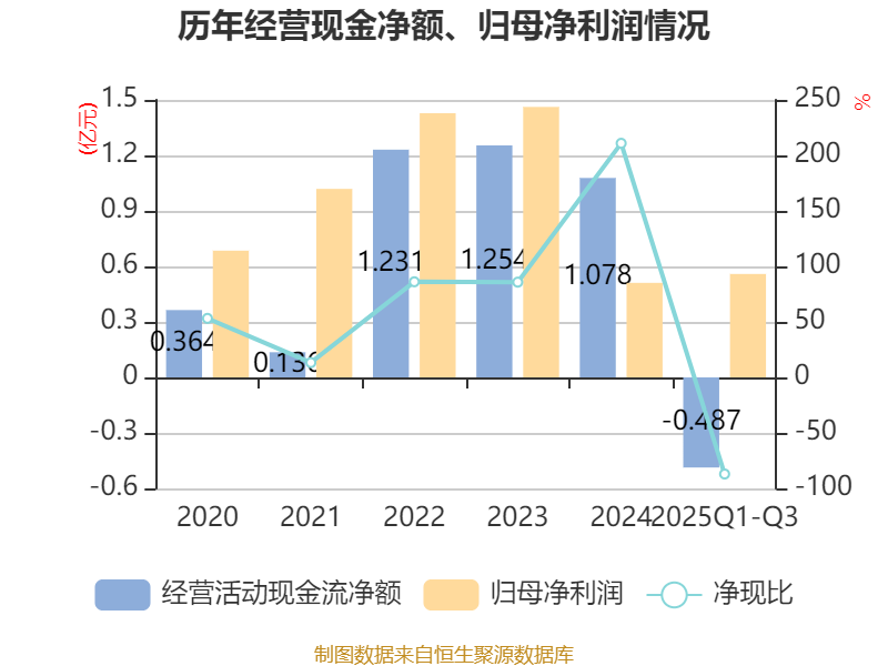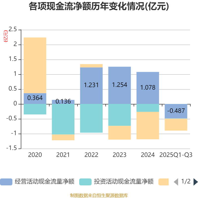 2025年前三季度,公司经营活动现金流净额为-4868.68万元,同比减少5036.26万元;筹资活动现金流净额-4016.63万元,同比增加3291.09万元;投资活动现金流净额-92.83万元,上年同期为-2425.53万元。