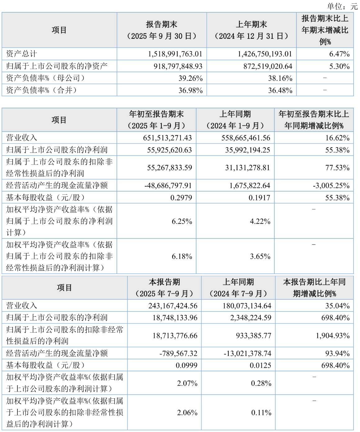 负债重大变化方面,截至2025年三季度末,公司应付票据及应付账款较上年末增加12.84%,占公司总资产比重上升1.66个百分点;一年内到期的非流动负债较上年末减少88.17%,占公司总资产比重下降0.98个百分点;应交税费较上年末增加266.91%,占公司总资产比重上升0.56个百分点;应付职工薪酬较上年末增加52.11%,占公司总资产比重上升0.38个百分点。