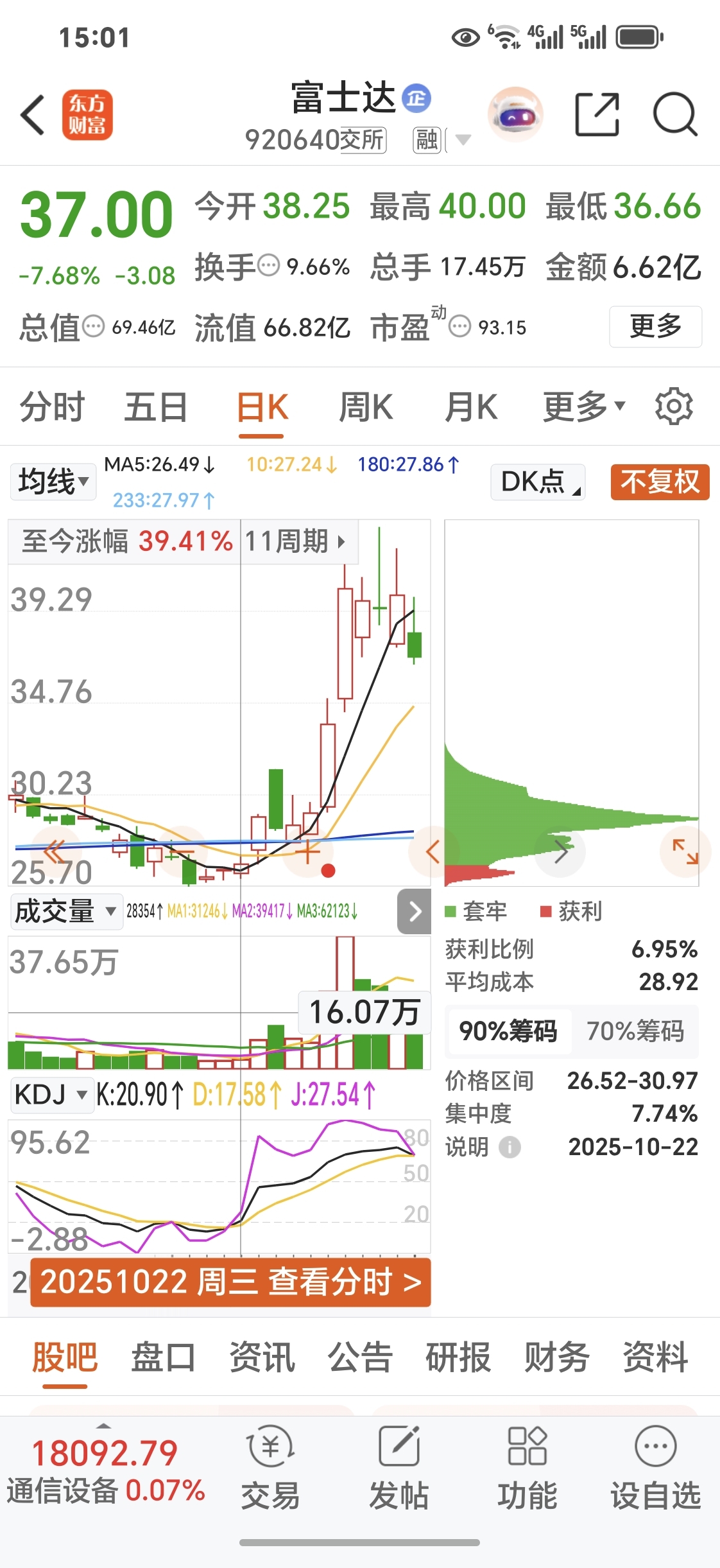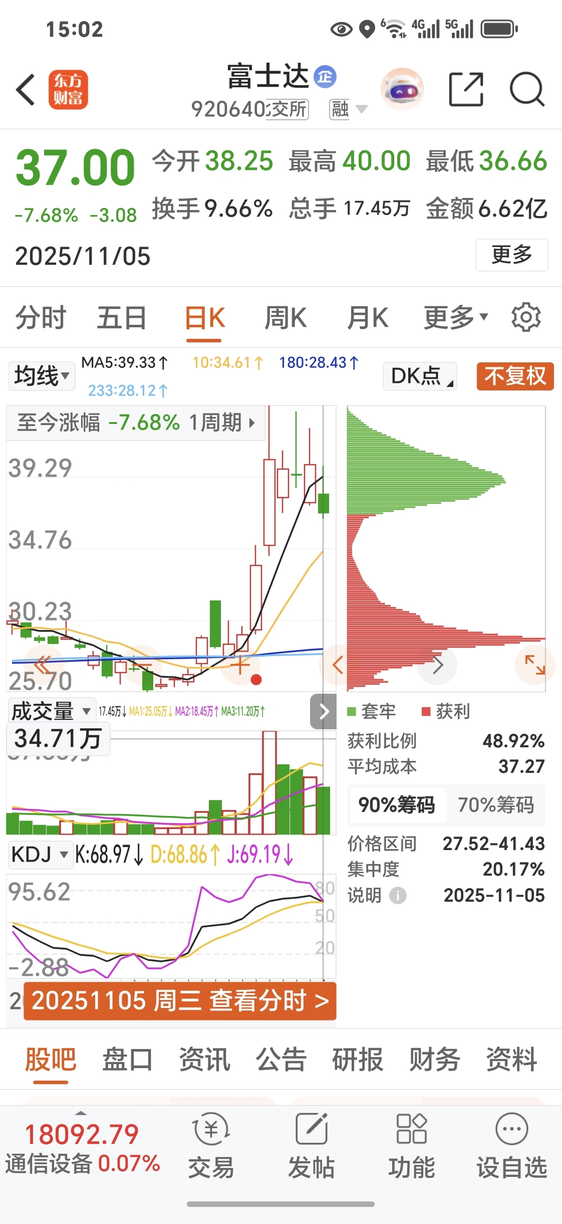 $富士达(SZ920640)$ KDJ出现死叉,短期会调整,从筹码分布看低位集中筹码并没有松动,后面反复振荡回踩10日均线后应该会反弹,密切关注筹码峰的分布,一旦底部筹码峰缩小就撤,不缩就持股等2波。