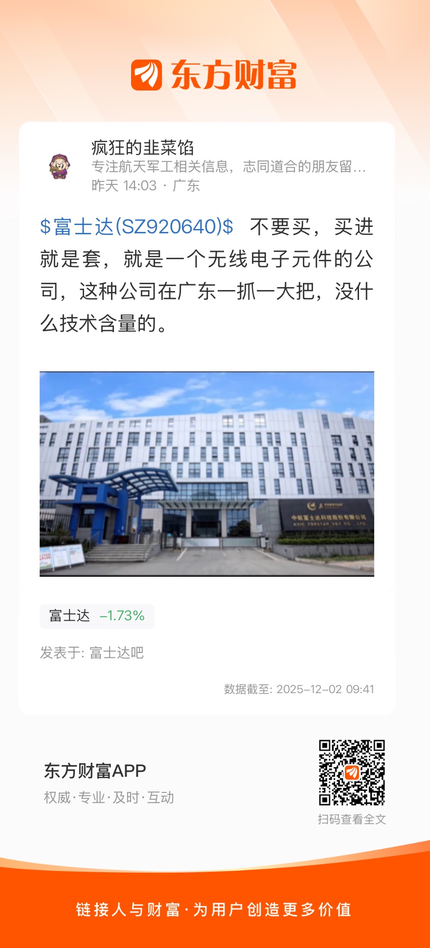 $富士达(SZ920640)$  不要买,买进就是套,就是一个无线电子元件的公司,这种公司在广东一抓一大把,没什么技术含量的。