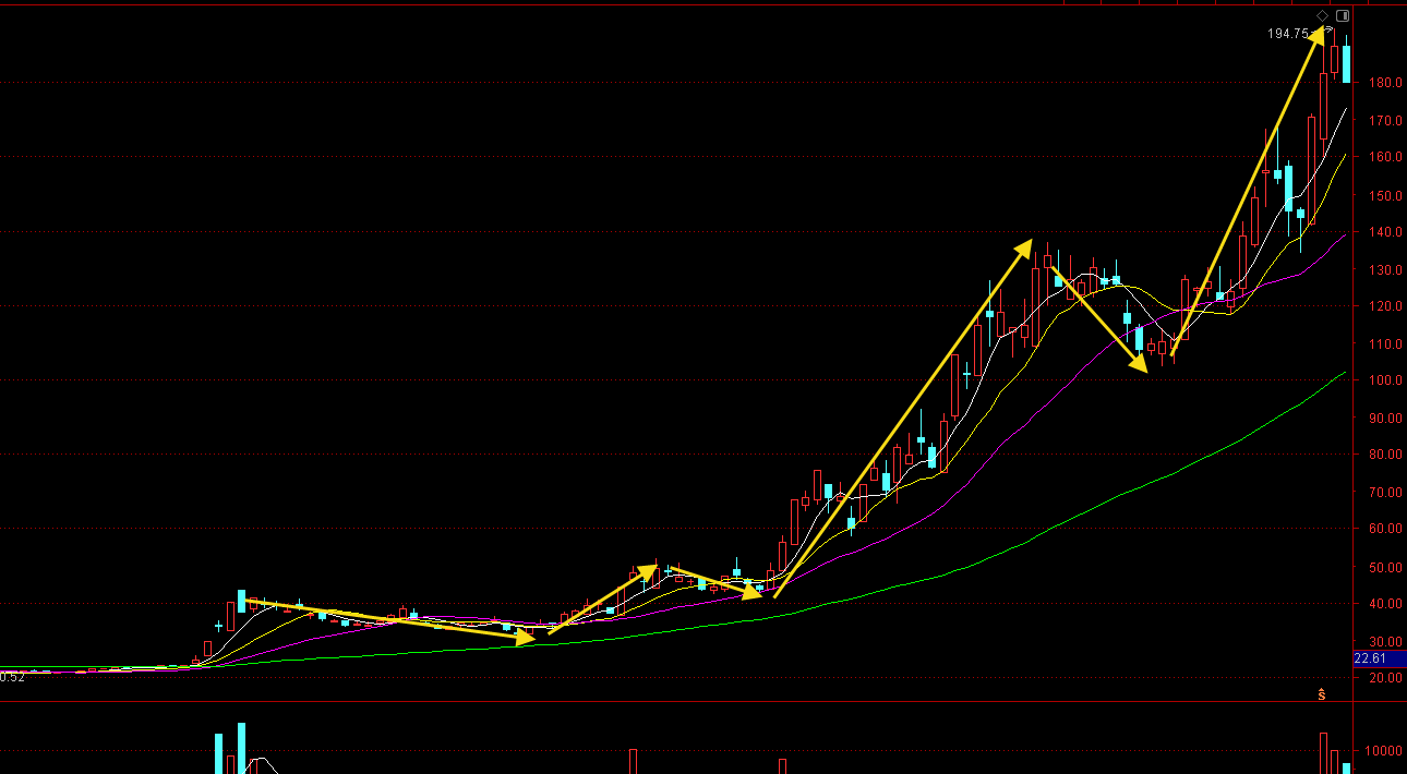如果看第2张图,那么现在跑是对的,涨了一倍了,该跌了,但如果拉长时间,你在看第一张图,那么你会发现,这个位置其实是买点。你们能猜到这个是哪个票的图吗