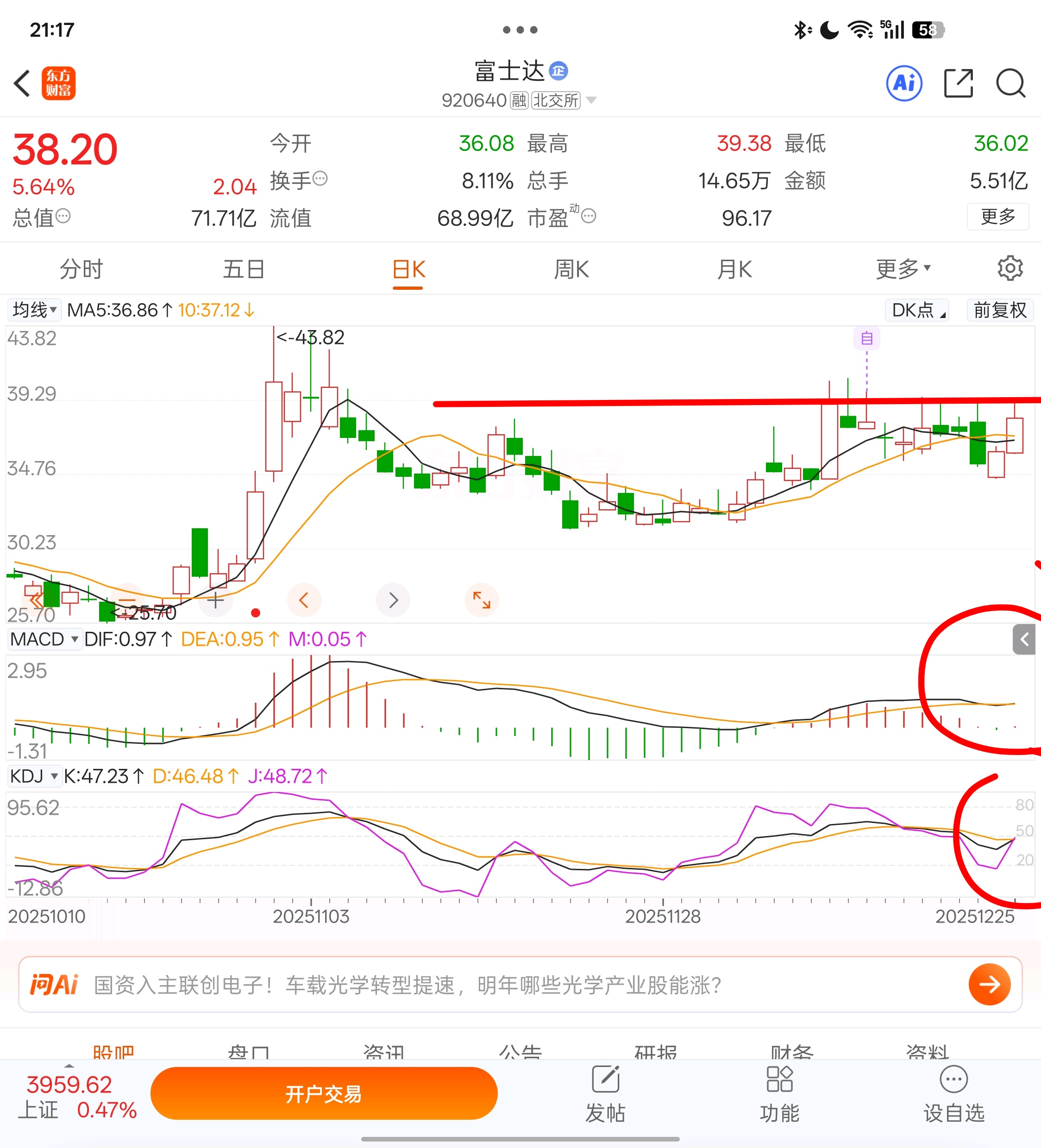 $富士达(SZ920640)$ 人为做出来的阻力位,应该能轻易突破,今天难得的两个技术指标同时交叉,明天板块只要不崩,应该会突破前高,量能一定要配合,换手率冲到15以上。