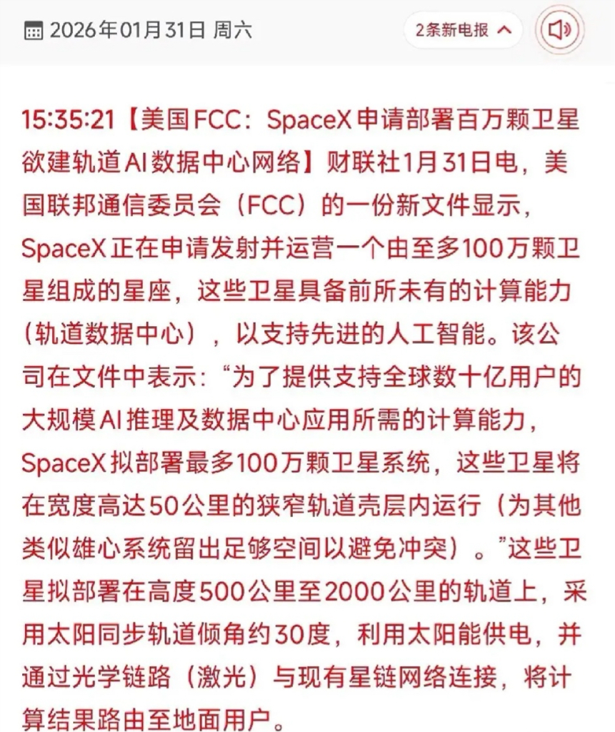 SpaceX申请发射运营由100万颗卫星组成的星座,标志着星链与星舰项目进入大规模扩张阶段,直接拉动航天材料、元器件、结构件等核心环节需求。国内供应链企业在恒星敏感器、高速连接器、航天级合金等关键领域实现卡位,部分已批量供货,部分为潜在受益标的,商业航天与太空基建的爆发式增长将持续催化相关产业链。#社区牛人计划#  #股市怎么看#