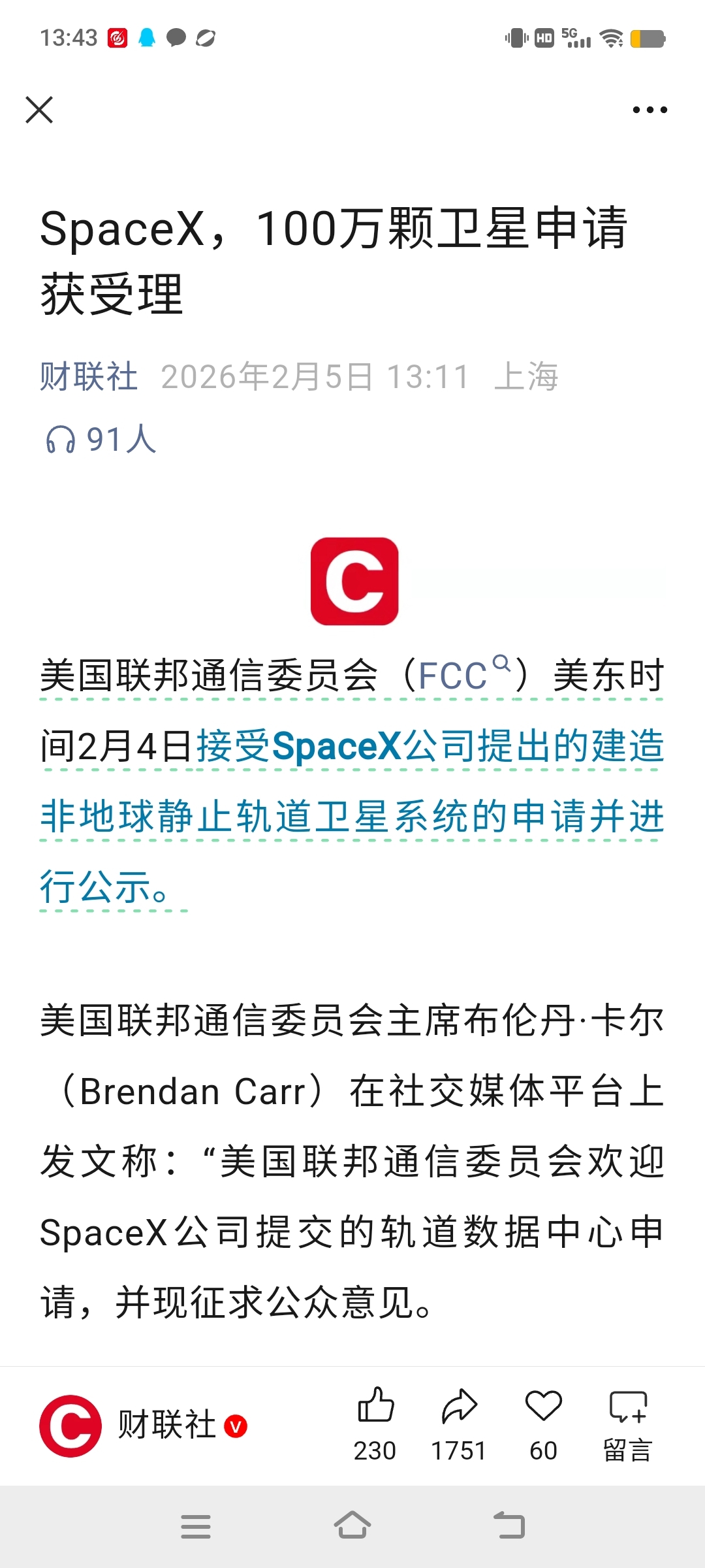 $富士达(SZ920640)$ 马斯克百万颗卫星轨道申请获受理