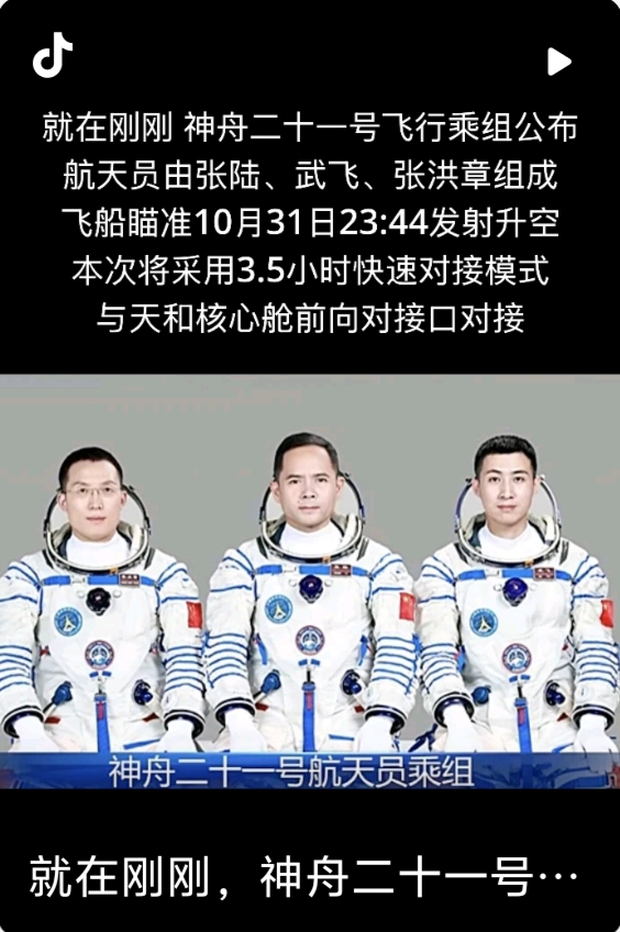 10月30日上午,神舟二十一号载人飞行任务新闻发布会在酒泉卫星发射中心召开,中国载人航天工程新闻发言人张静波宣布了上述发射时间。飞行乘组由张陆、武飞、张洪章组成,张陆担任指令长,3名航天员分别为航天驾驶员、飞行工程师和载荷专家,涵盖了我国现役3种航天员类型。