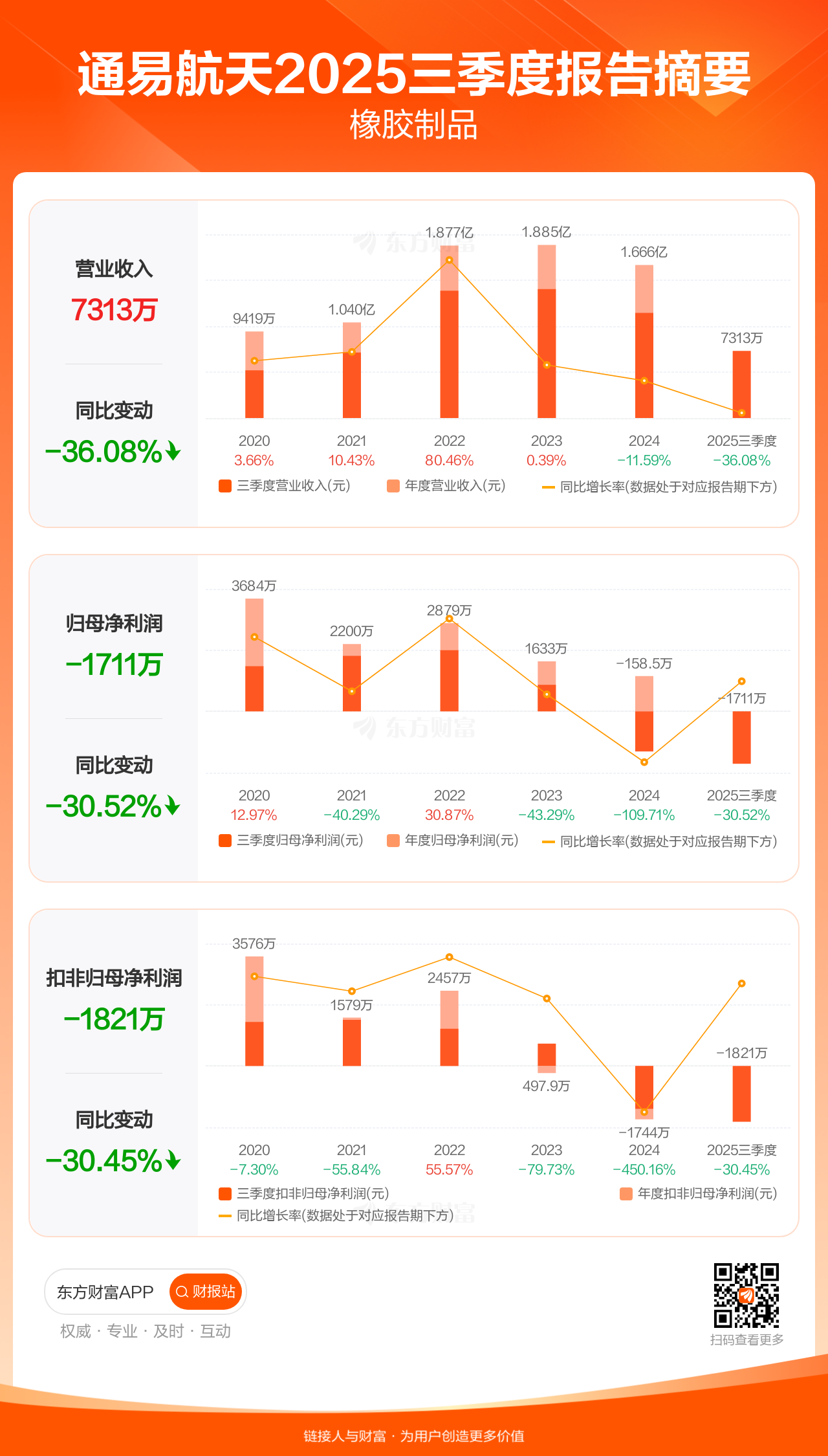 通易航天10月30日发布2025年三季报显示,公司前三季实现营业收入7312.64万元,同比下滑36.08%;归母净利润-1710.61万元;扣非归母净利润-1820.94万元。