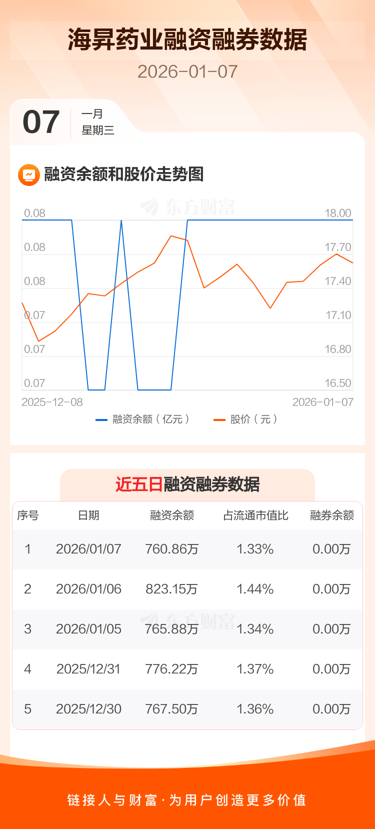 交易所最新数据显示,海昇药业于2026年1月7日获融资买入22.30万元,融资偿还84.60万元,当日融资净偿还62.3万元。目前,该股融资余额760.86万,占流通市值比例为1.33%。