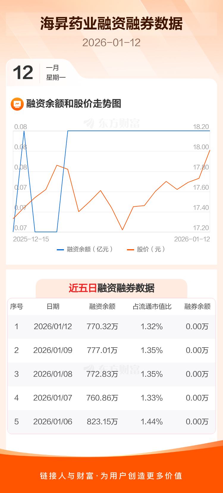 交易所最新数据显示,海昇药业于2026年1月12日获融资买入42.90万元,融资偿还49.60万元,当日融资净偿还6.69万元。目前,该股融资余额770.32万,占流通市值比例为1.32%。