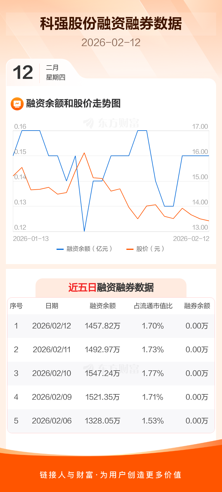 交易所最新数据显示,科强股份于2026年2月12日获融资买入129.55万元,融资偿还164.70万元,当日融资净偿还35.14万元。目前,该股融资余额1457.82万,占流通市值比例为1.70%。