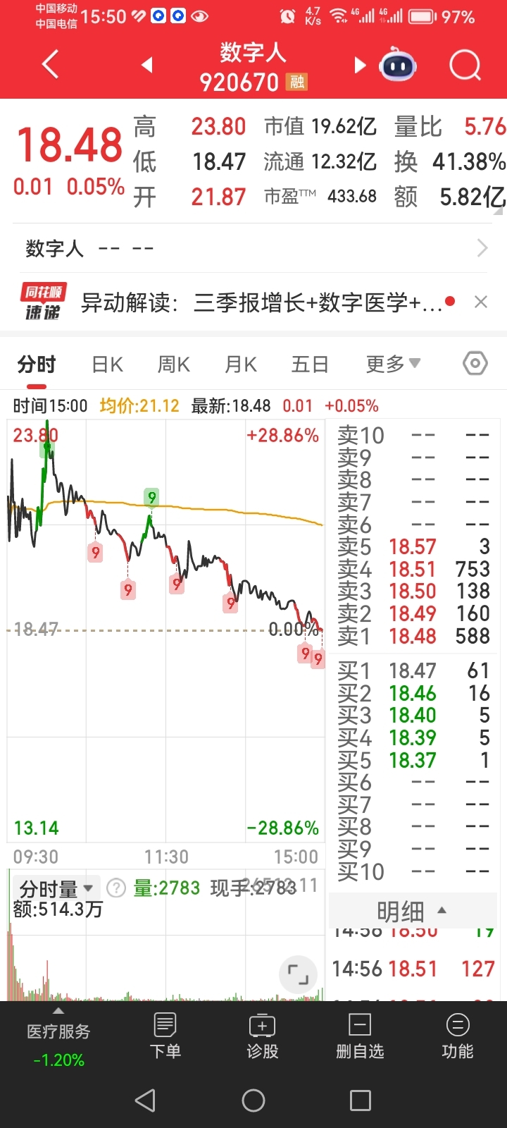 $数字人(SZ920670)$ $数字人(920670)$ 主力今天尾盘最后洗昨天打板资金,没有水下算是良心,昨天打板资金尾盘跑没有获利,也是没有亏钱,短线资金获利盘尾盘跑没了,明天压力很小了,今天上午21以上买入资金,明天获利抛压不是很大。
