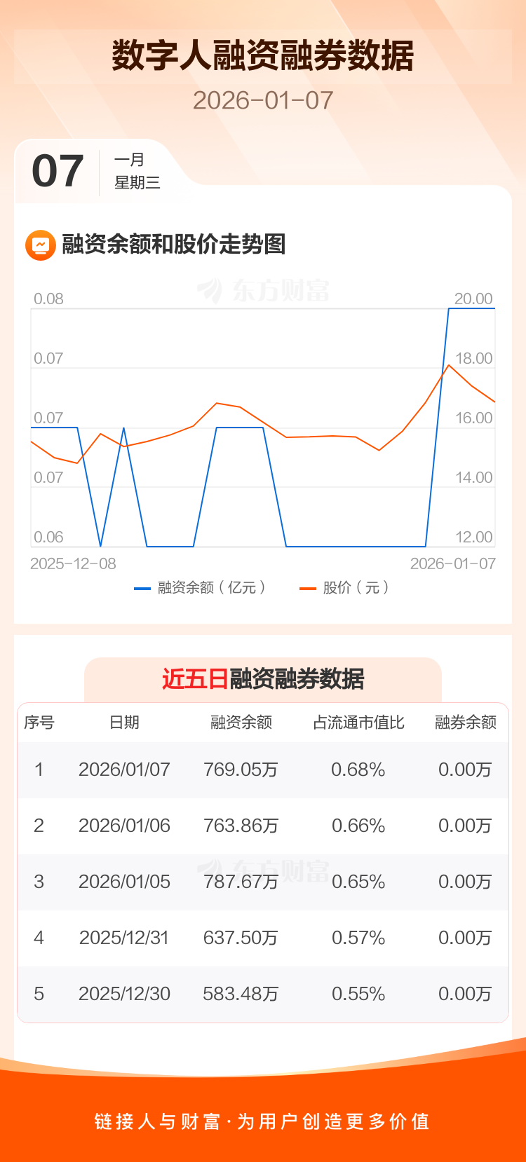 交易所最新数据显示,数字人于2026年1月7日获融资买入79.37万元,融资偿还74.18万元,当日融资净买入5.19万元。目前,该股融资余额769.05万,占流通市值比例为0.68%。