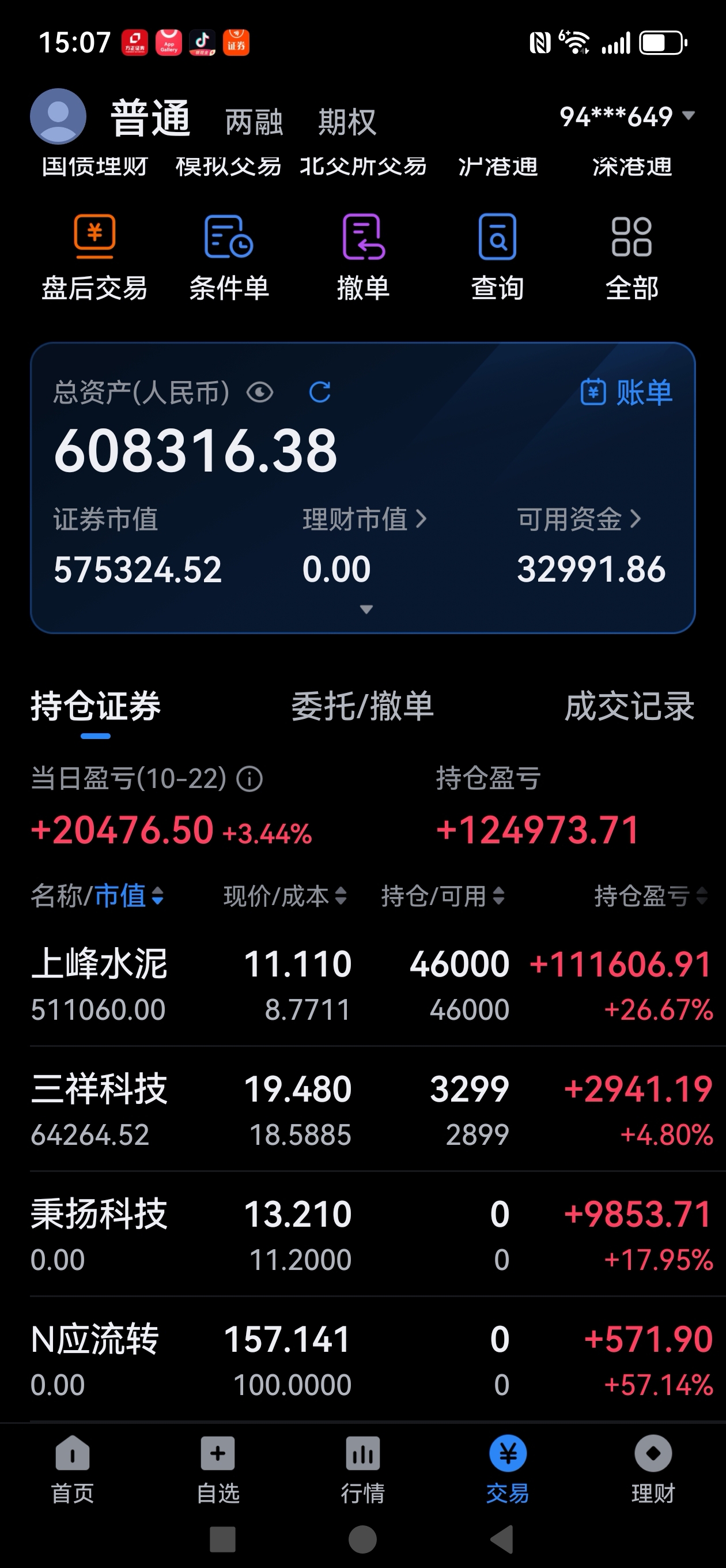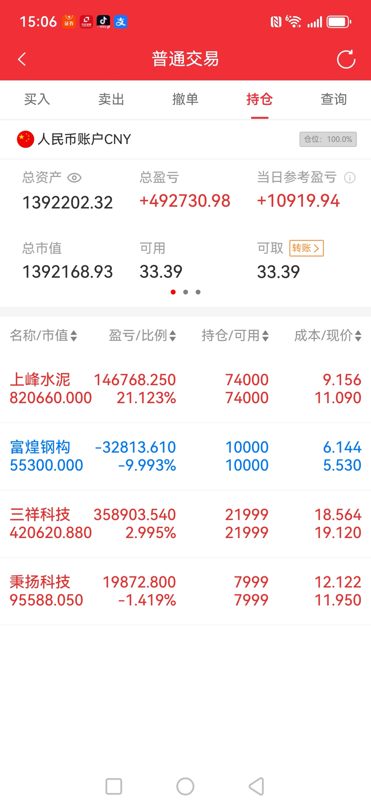 $秉扬科技(SZ920675)$ 还好之前拉升卖了三分之二,股东减持近段没戏,但给低吸低价机会,本只5千股,周四又补了2千股,留这几千股作纪念(卖了不会再关注),看能跌到多少价位,遂步低吸潜伏,明年在战!现重仓在上峰水泥!如赚钱在回低吸秉杨。个人策略不推荐股票。