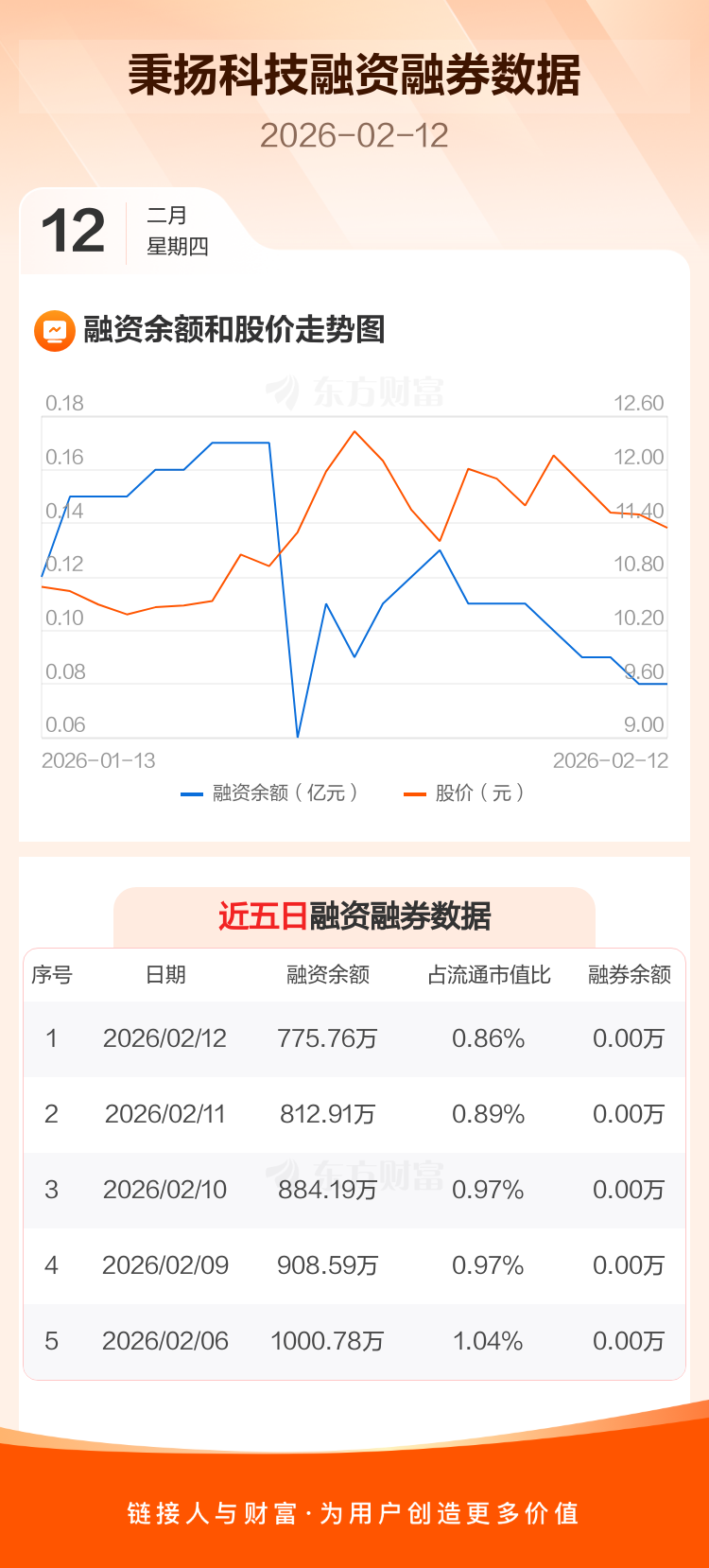 交易所最新数据显示,秉扬科技于2026年2月12日获融资买入32.17万元,融资偿还69.32万元,当日融资净偿还37.15万元。目前,该股融资余额775.76万,占流通市值比例为0.86%。