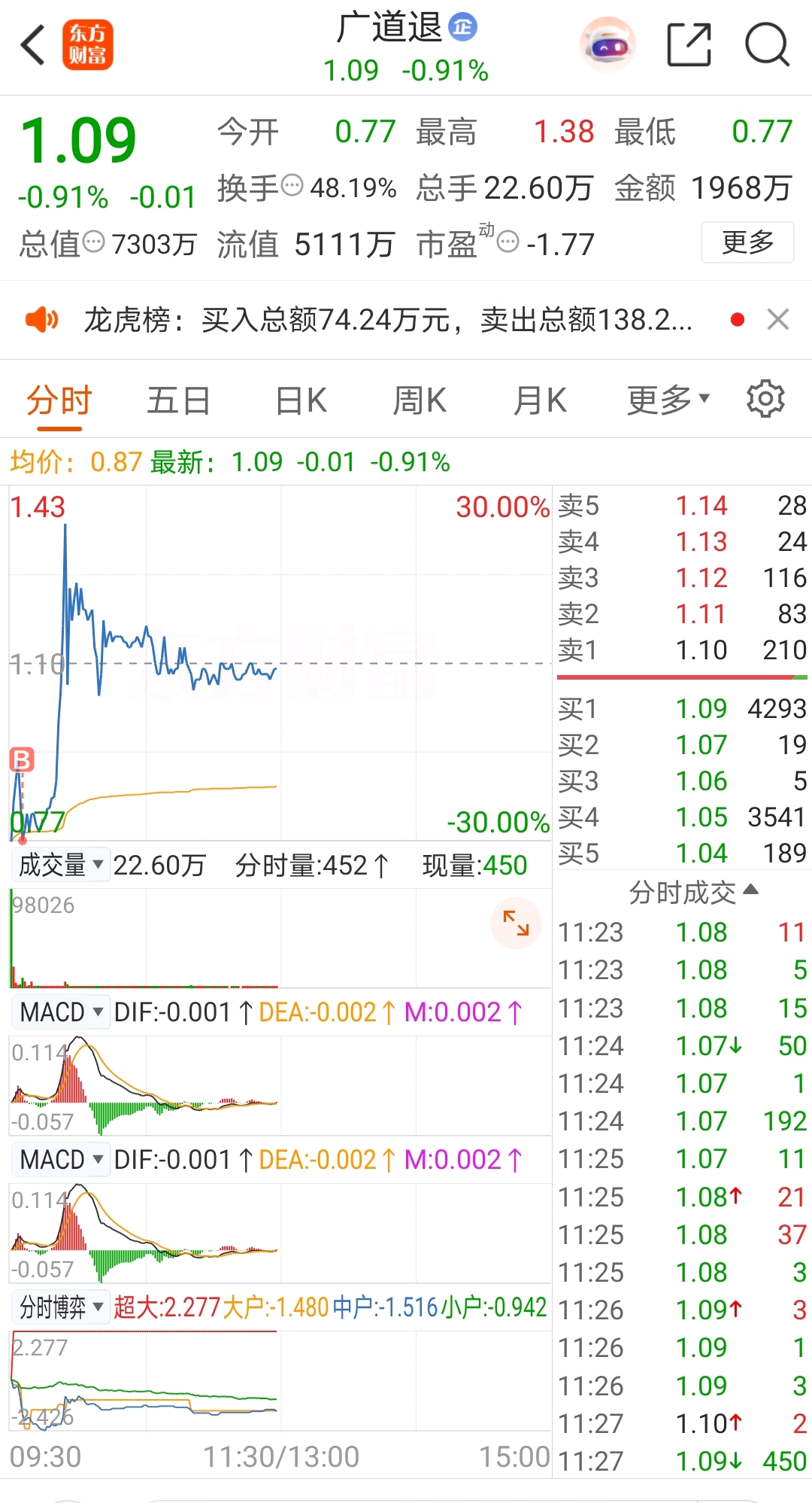$广道退(SZ920680)$ 这个股真牛,又盘中富贵,收盘不会还是跌停吧!!