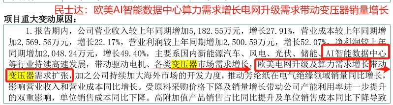 三市明确指出:业绩增长因欧美AI智能数据中心算力需求增长、欧美电网升级需求带动公司变压器产品销量增长的唯一一家(北交所)上市公司:民士达(下图)。这是迄今在北交所最明确算力紧缺致使电网升级收益的上市公司。且公司第一类产品介绍即为特高压变压器产品(下图)
